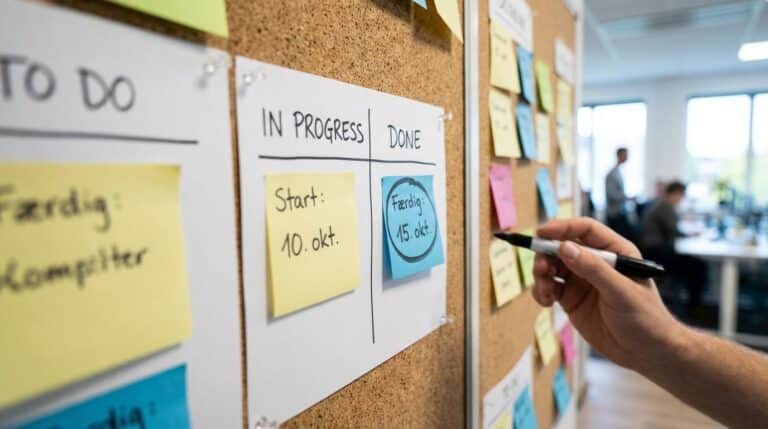 - Dag 2-3: Sæt en enkel WIP-grænse på de vigtigste “I gang”-kolonner, og vær nysgerrig på hvad den afslører.