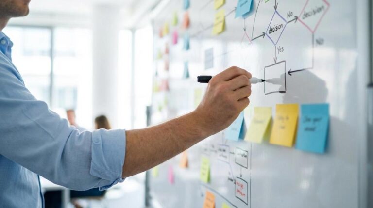 I praksis fungerer det bedst, når kortlægningen laves sammen med dem, der udfører arbejdet. Ikke som en skrivebordsøvelse. Brug whiteboard, digital tavle eller et simpelt flowdiagram, og hold fokus på “hvad sker der” frem for “hvad burde ske”.
